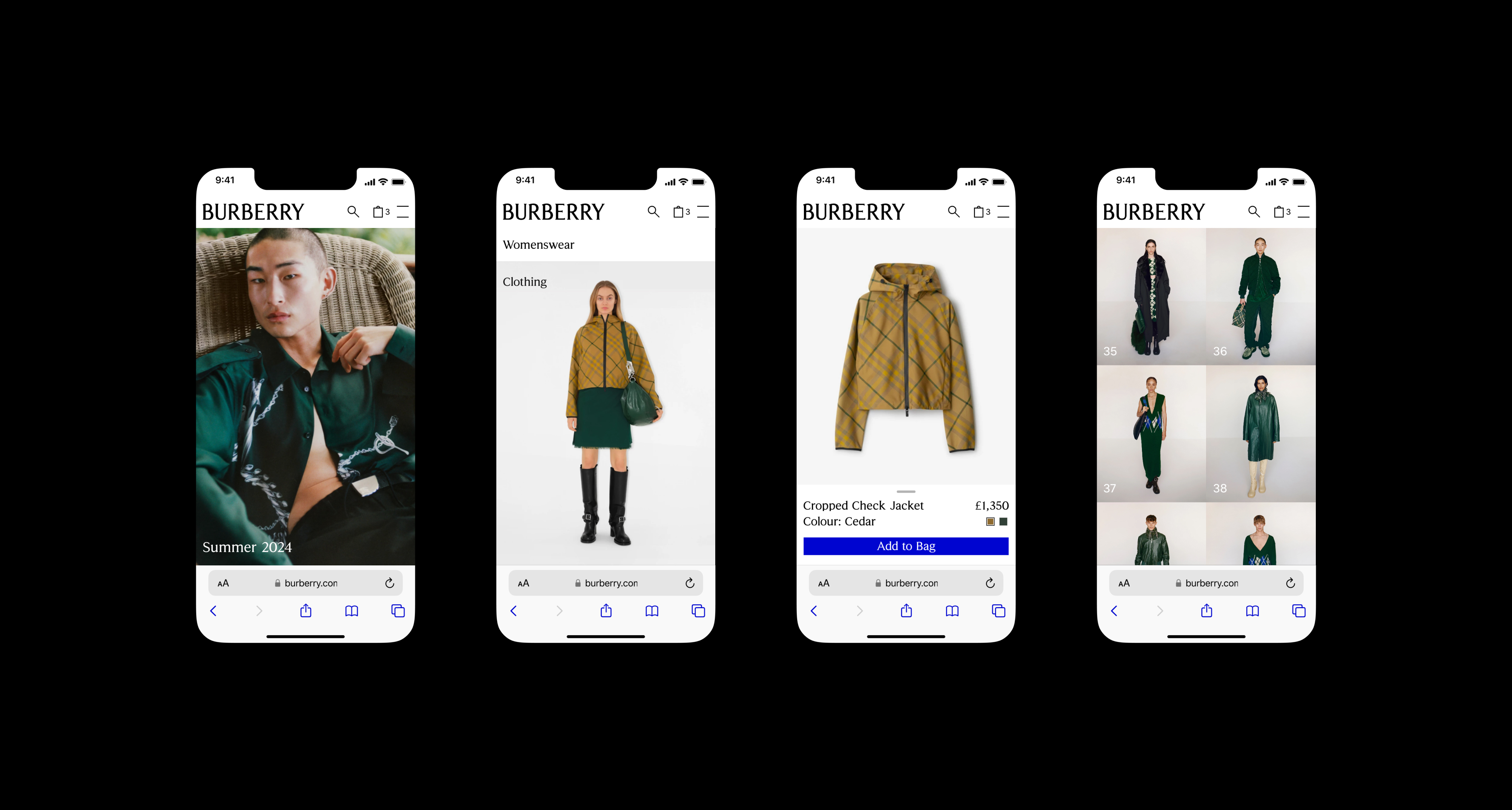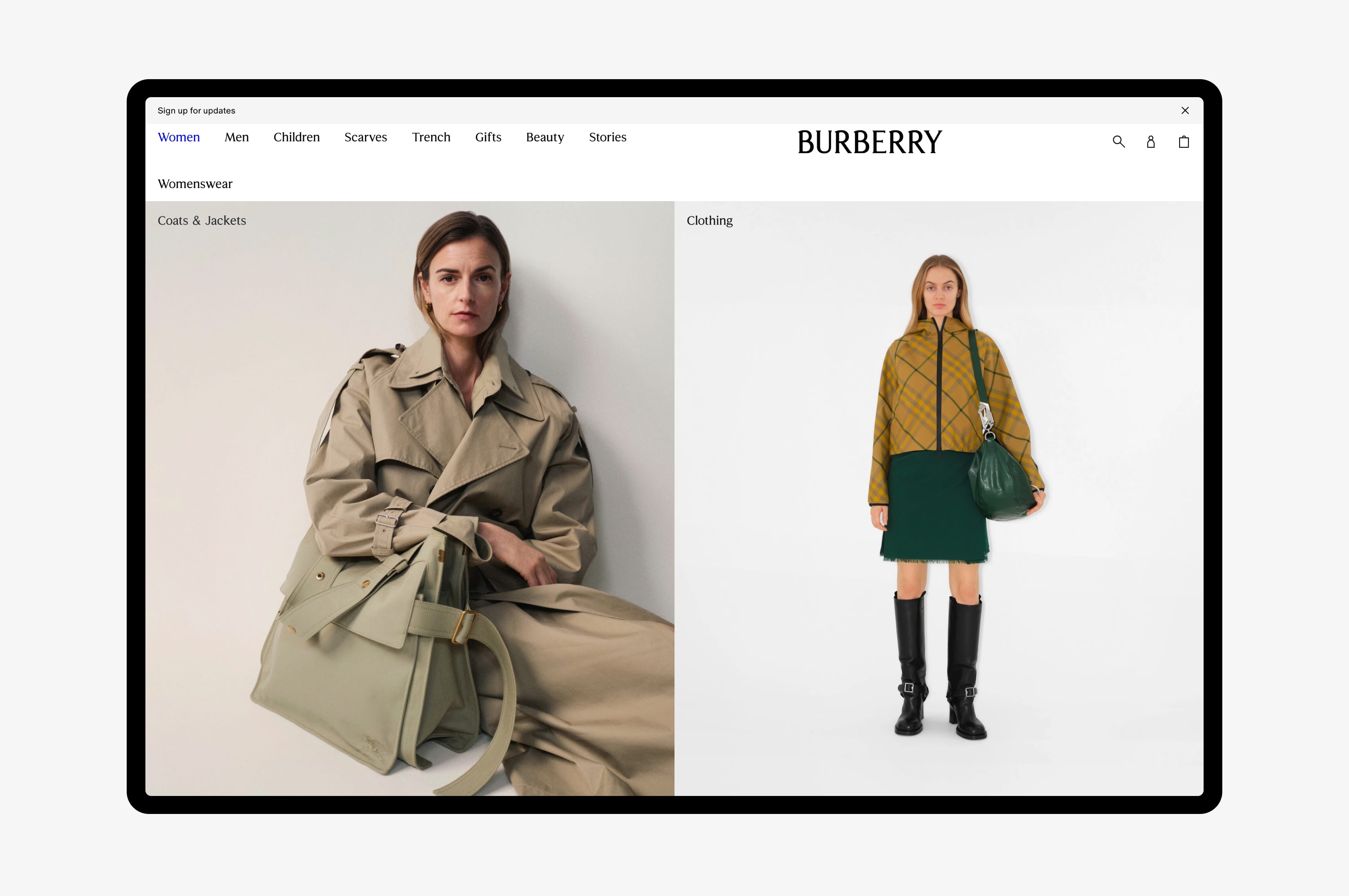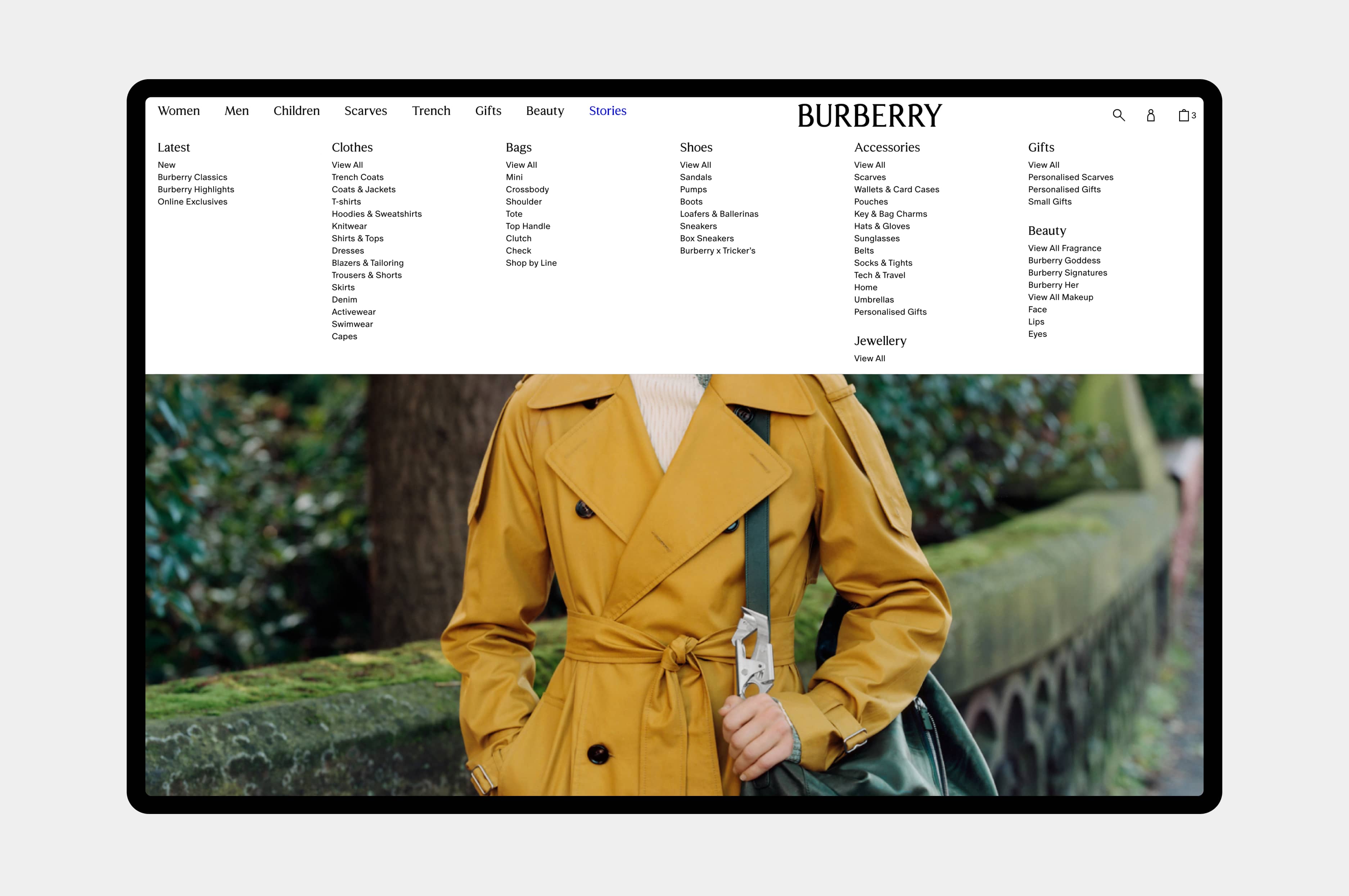 I worked closely on the redesign of Burberry.com to reflect the brand's new vision under Daniel Lee. This comprehensive project encompassed a new visual identity, including a refresh of the home and landing pages. The product catalog received an overhaul, with revamped PLPs and PDPs featuring enhanced product cards and exposed filters for a more intuitive browsing experience. A streamlined navigation system further facilitated user journeys across the site.