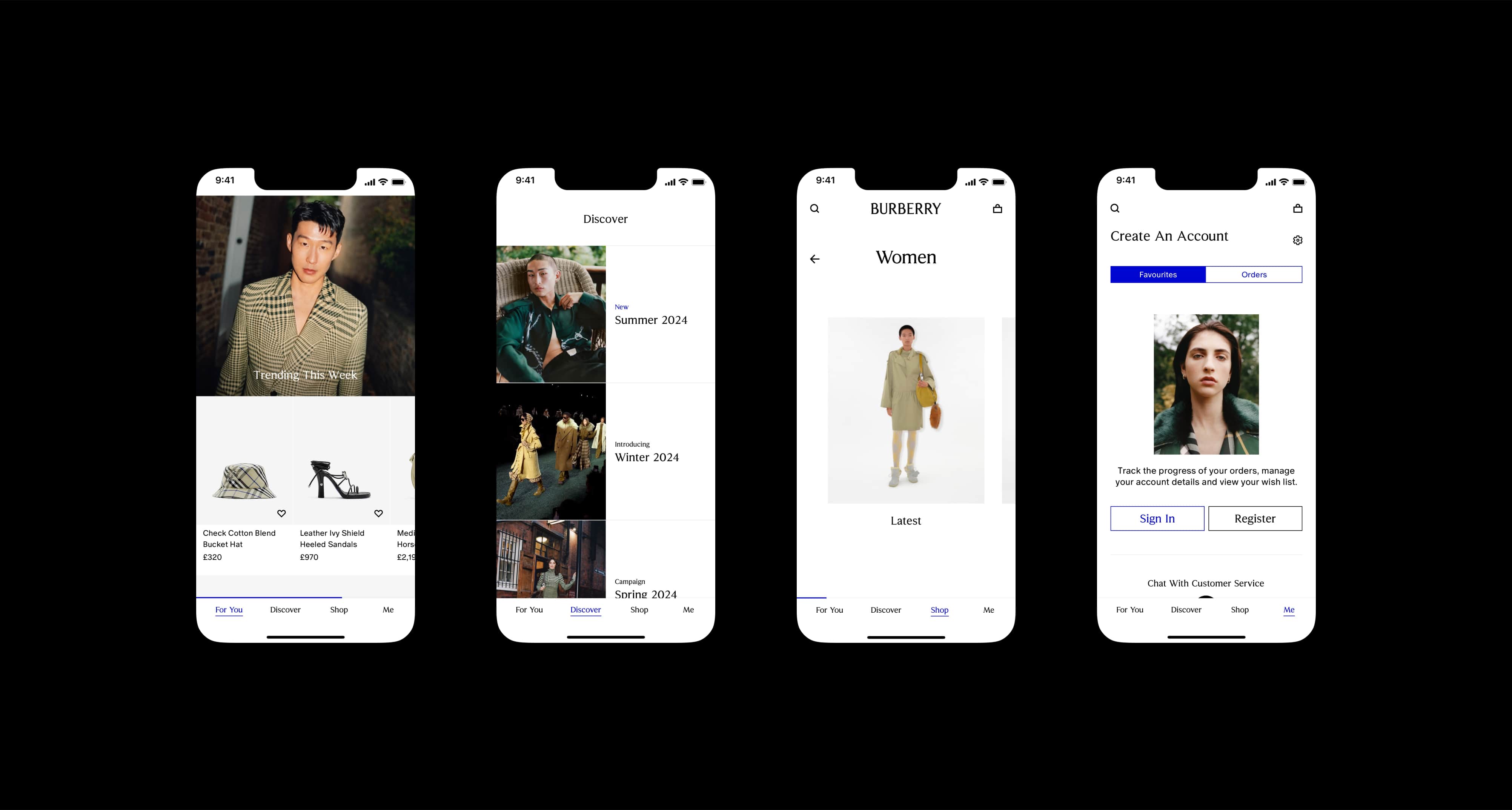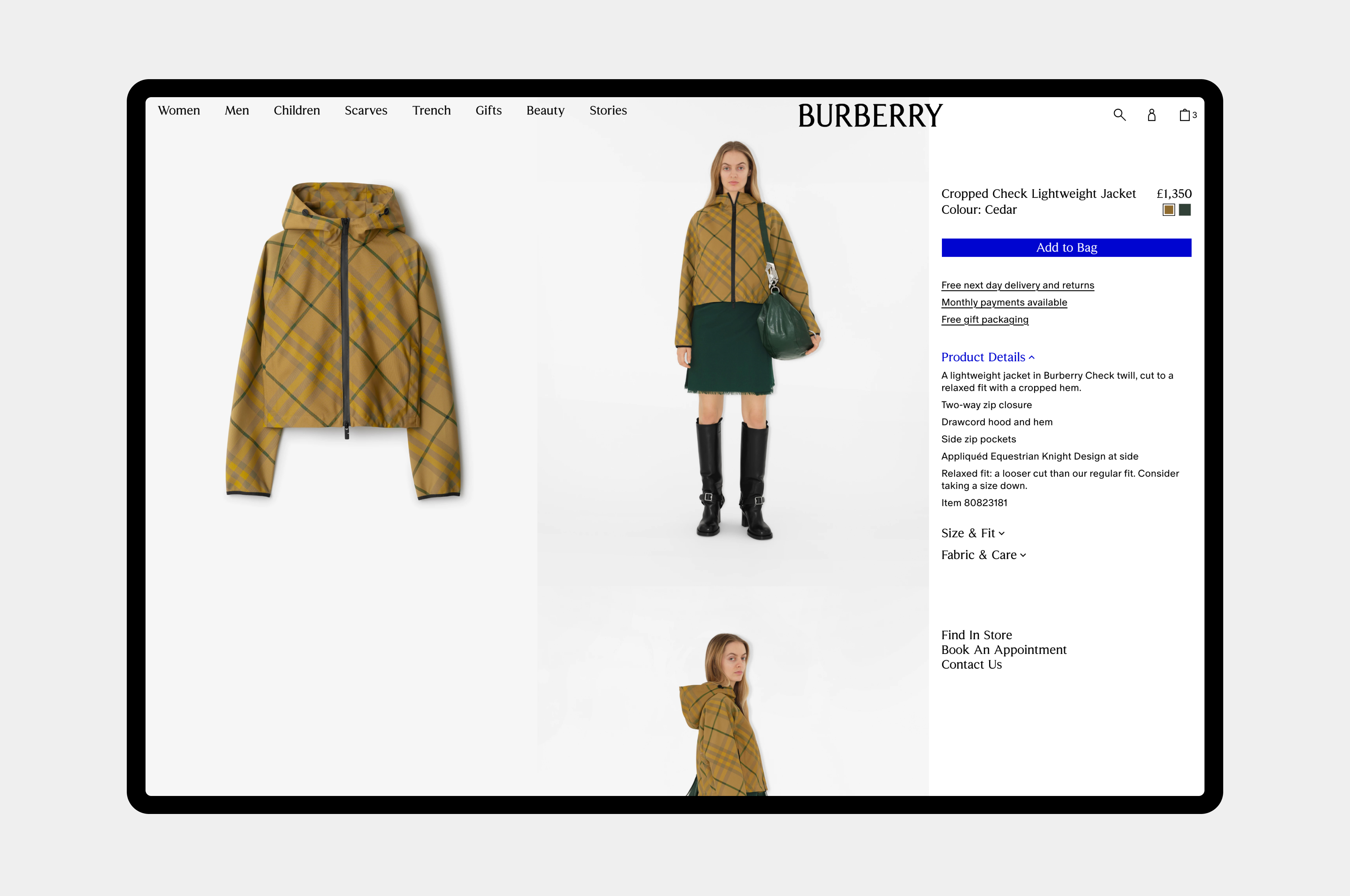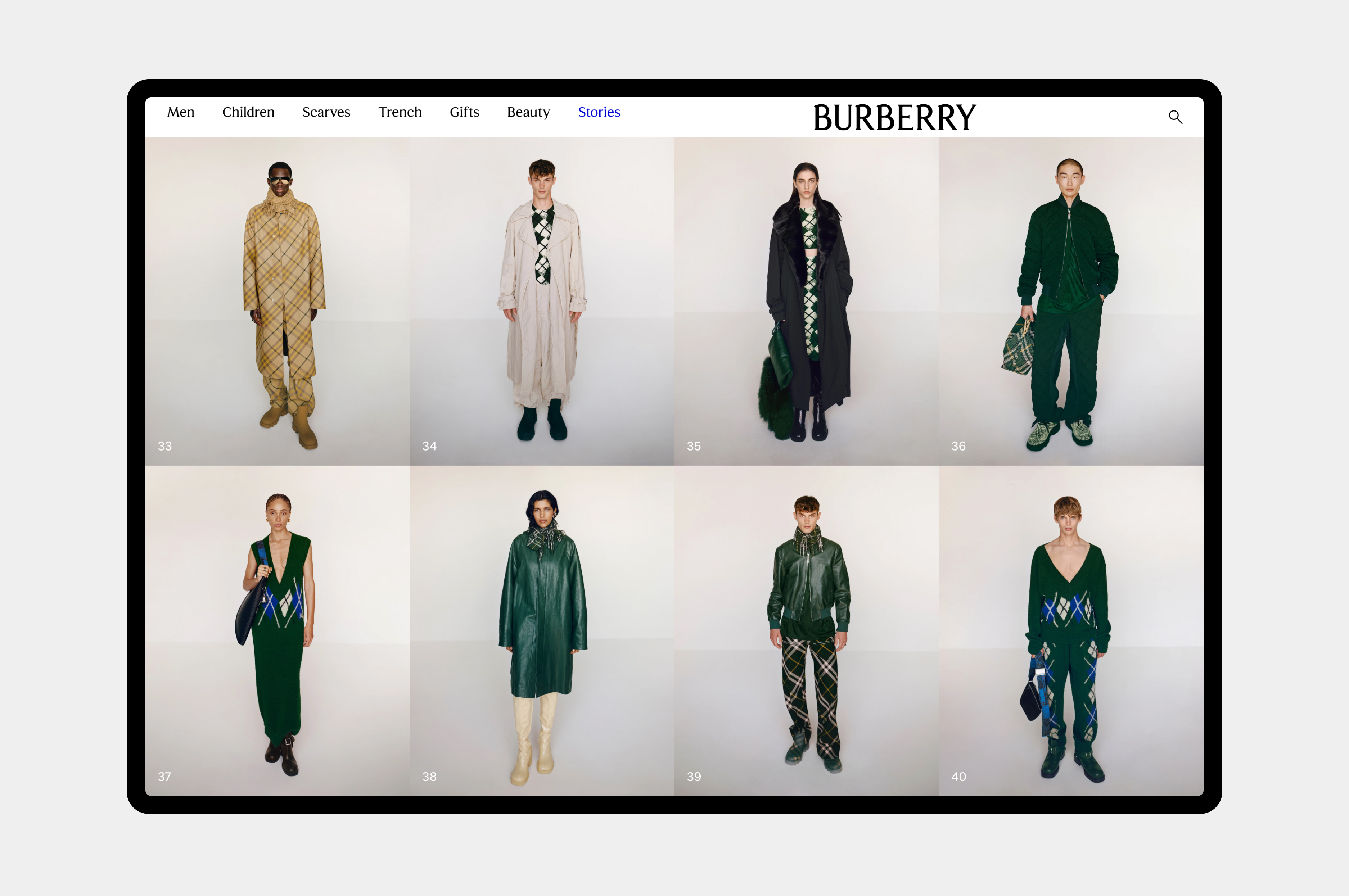 I worked closely on the redesign of Burberry.com to reflect the brand's new vision under Daniel Lee. This comprehensive project encompassed a new visual identity, including a refresh of the home and landing pages. The product catalog received an overhaul, with revamped PLPs and PDPs featuring enhanced product cards and exposed filters for a more intuitive browsing experience. A streamlined navigation system further facilitated user journeys across the site.